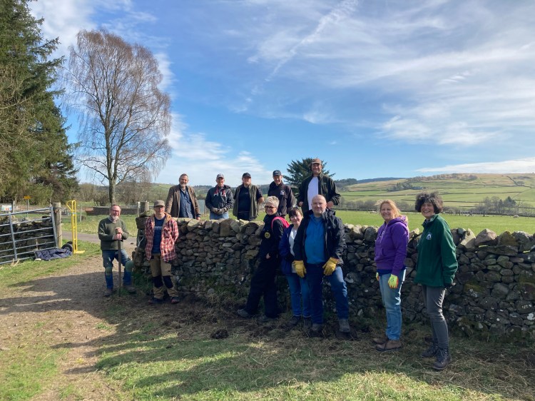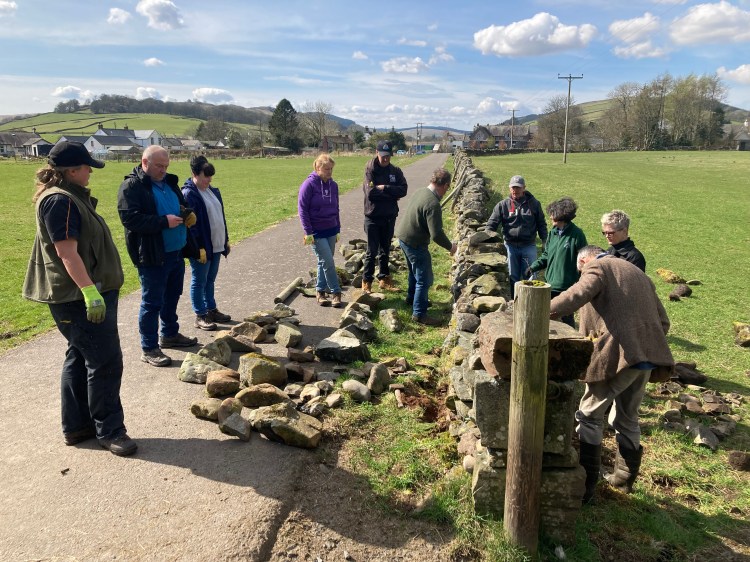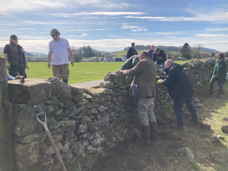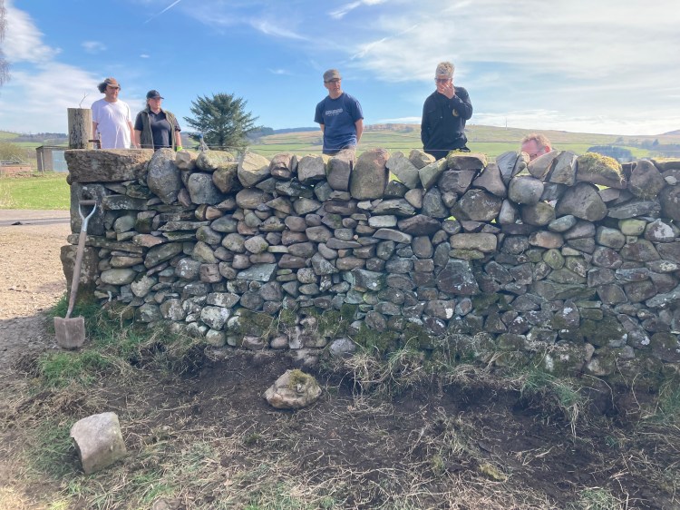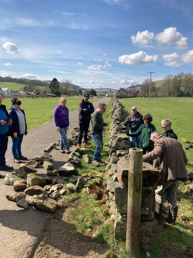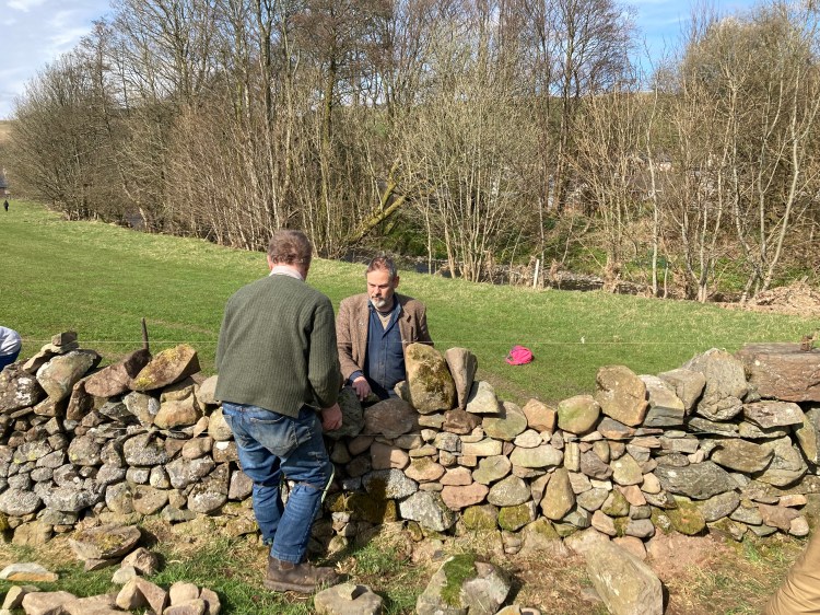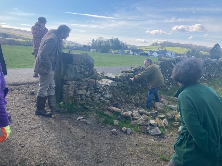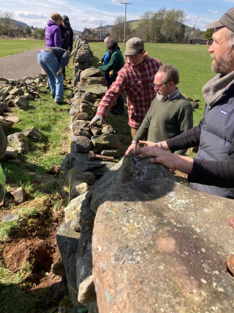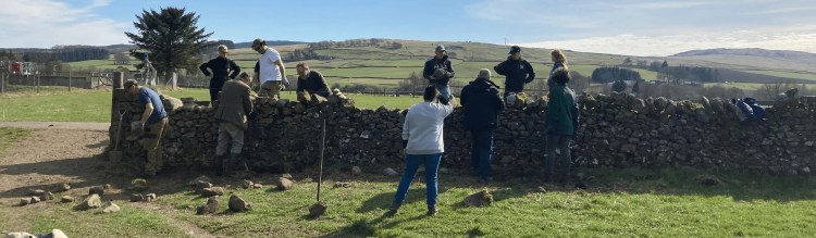 The sun was out for the first drystane dyking workshop. Jake Blackwood was the instructor for the day. He explained the principles of dyking and the names of the various types of stones within the dyke and their function. Thirteen pair of hands got to work and 2 hours later had fixed about ten meters of dyke.