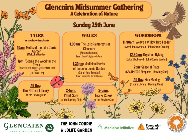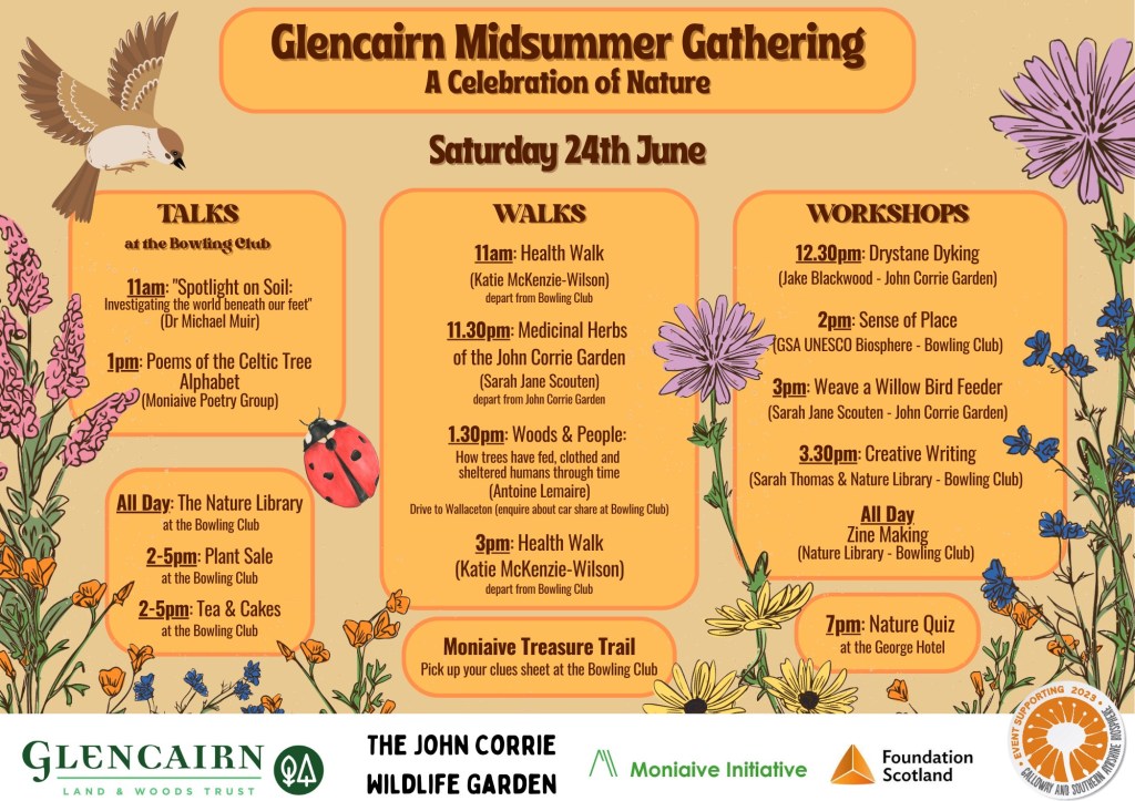 On the 24th and 25th June 2023, Moniaive hosted the first Glencairn Midsummer Gathering. Organised in collaboration with the Friends of the John Corrie Garden (visit their Facebook page here), the gathering celebrated the nature of Glencairn with activities for all the family.